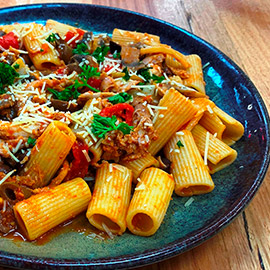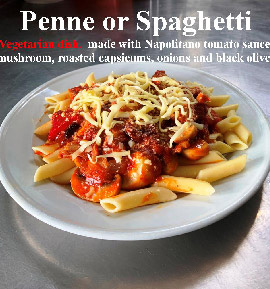 Ideal for vegetarians. Consists of a touch of garlic, onions, zucchini, Capsicums, mushrooms cooked in a Napoletana sauce and topped with Parmesan cheese and parsley.