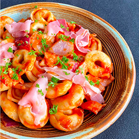 A very European dish. Made from a touch of garlic and olive oil Onions, bacon, shoulder ham, black pepper, cooked in a Napolitano sauce, topped with parmesan cheese And garnished with parsley.