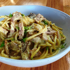 One of the most oldest and famous dish in Italy. A very simple but tasty sauce. Made from fried bacon cream, parmesan cheese white pepper and garnished with parsley.